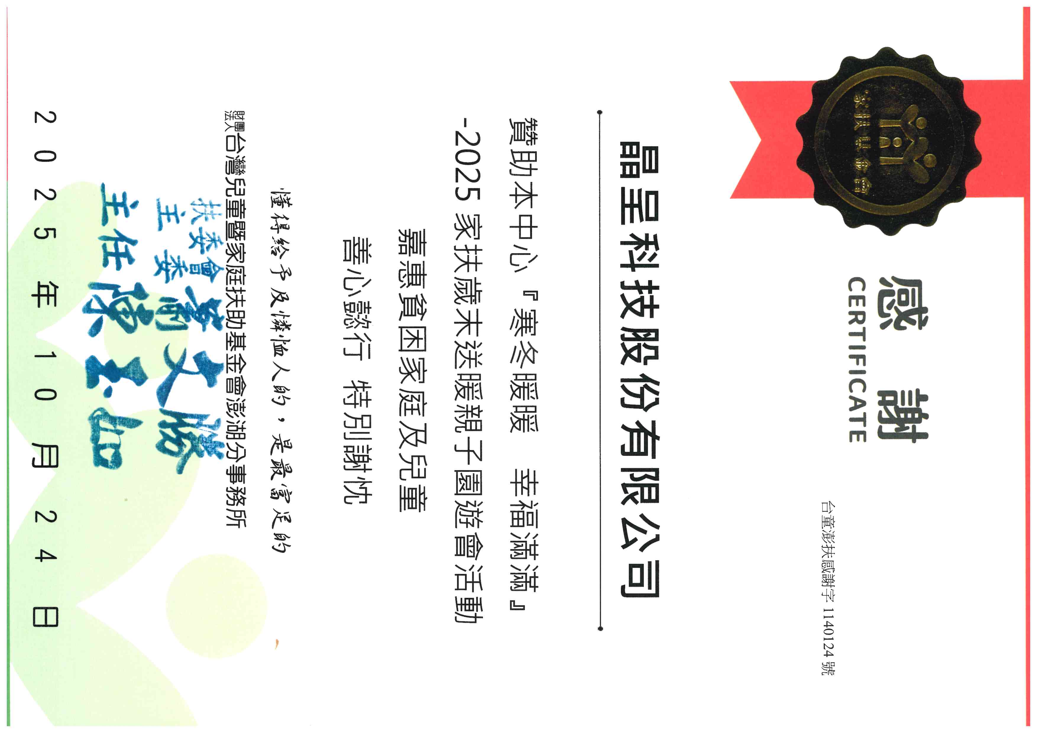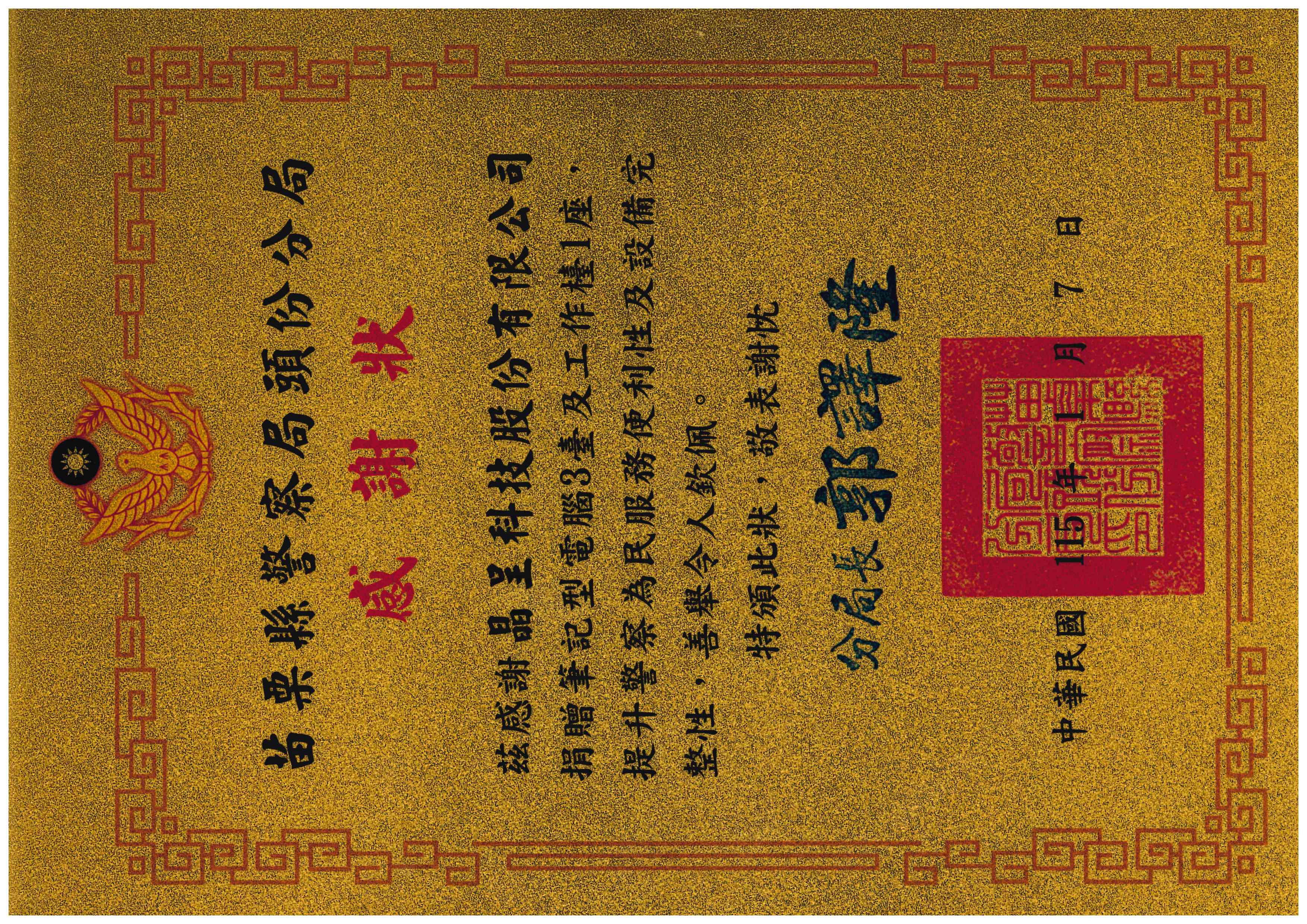 Certificate of Appreciation from the Penghu Branch, Taiwan Fund for Children and Families (TFCF)