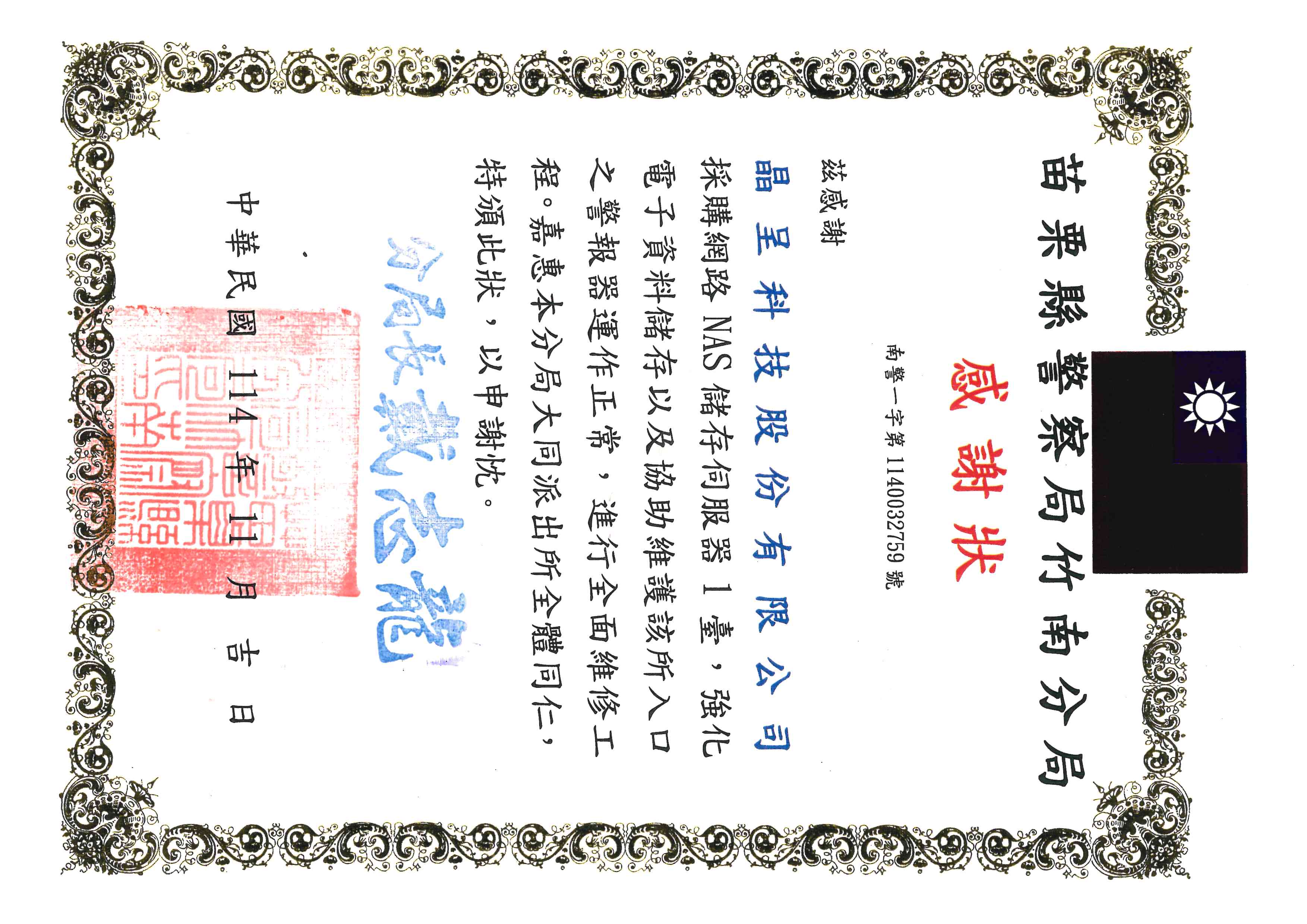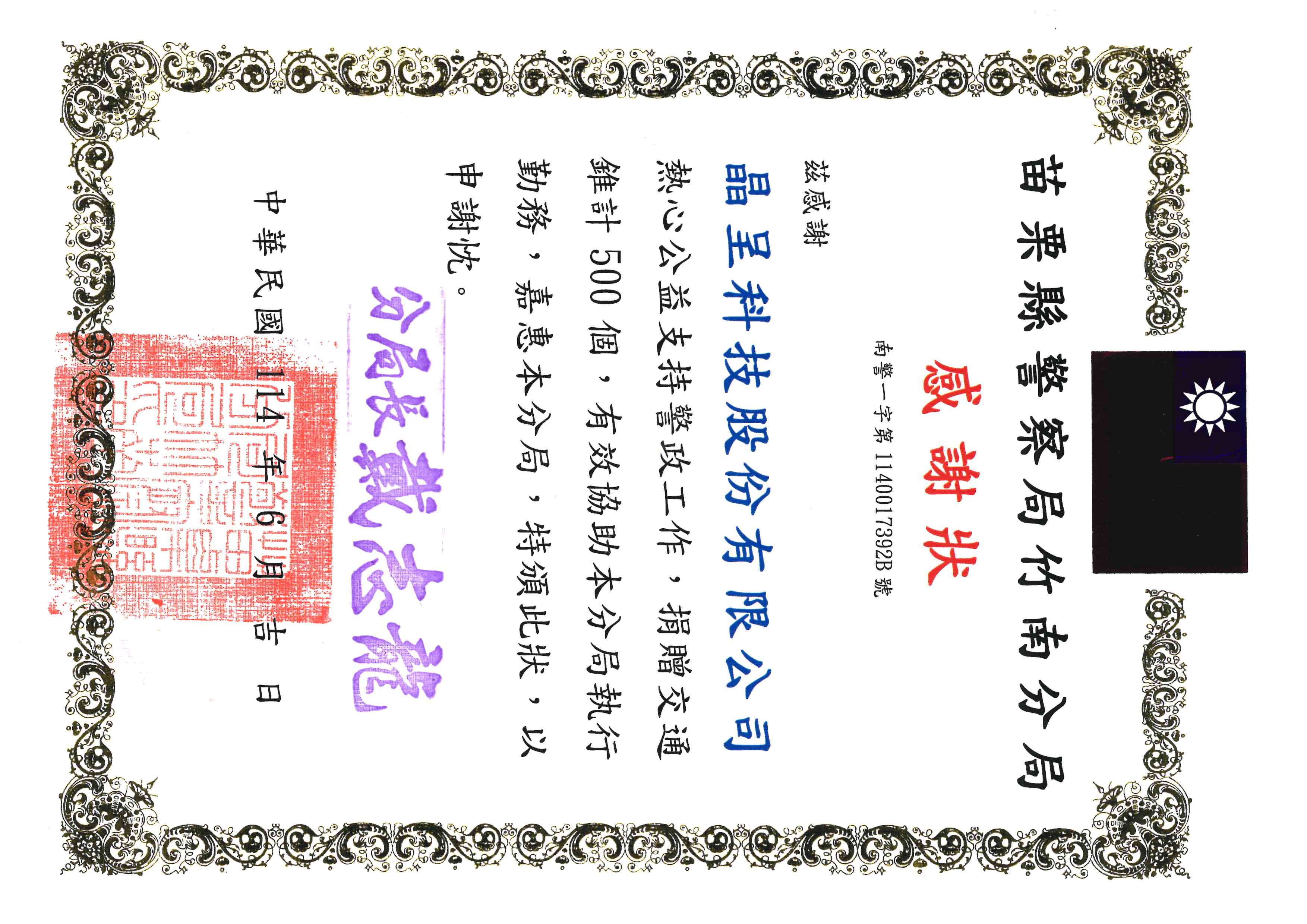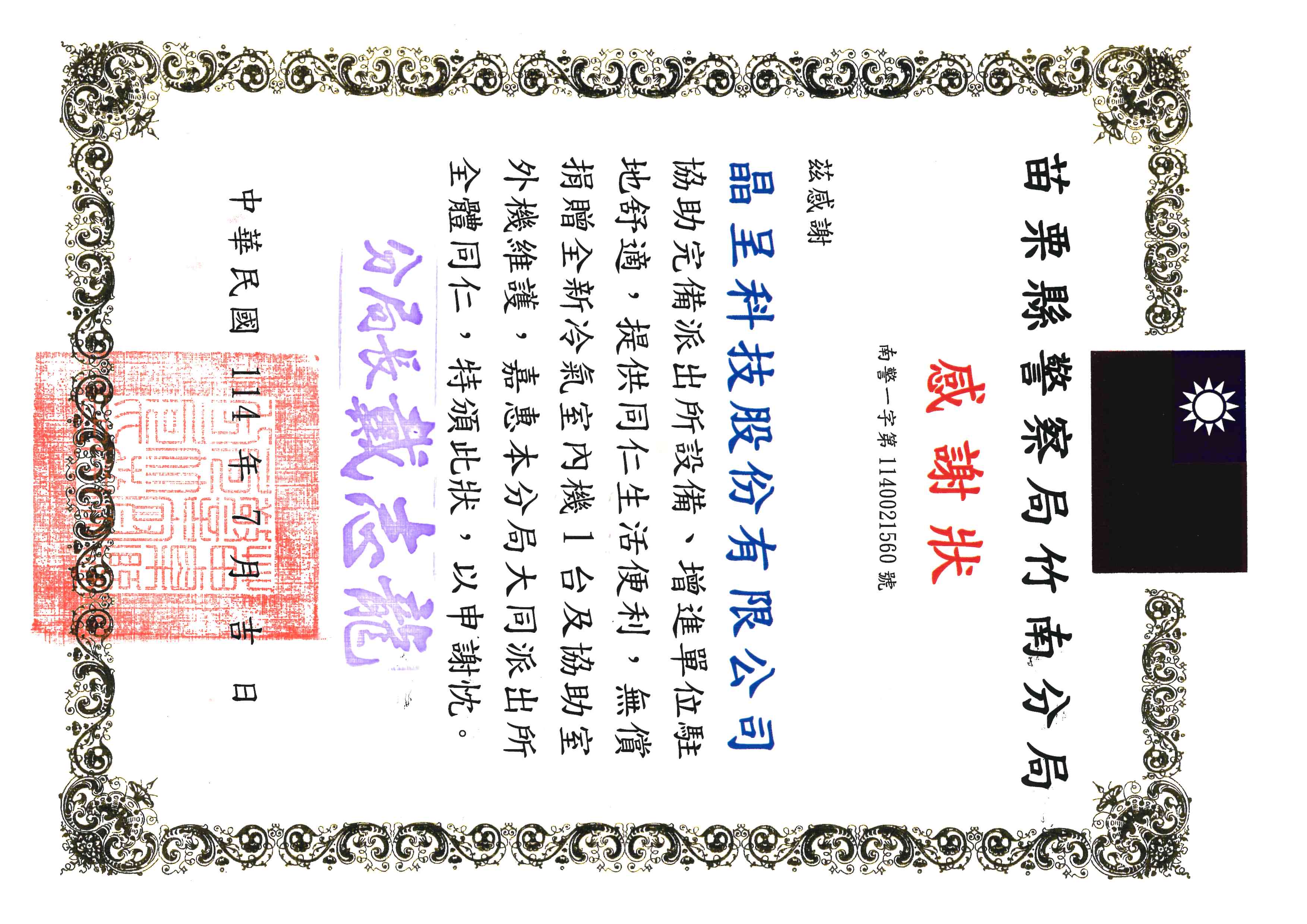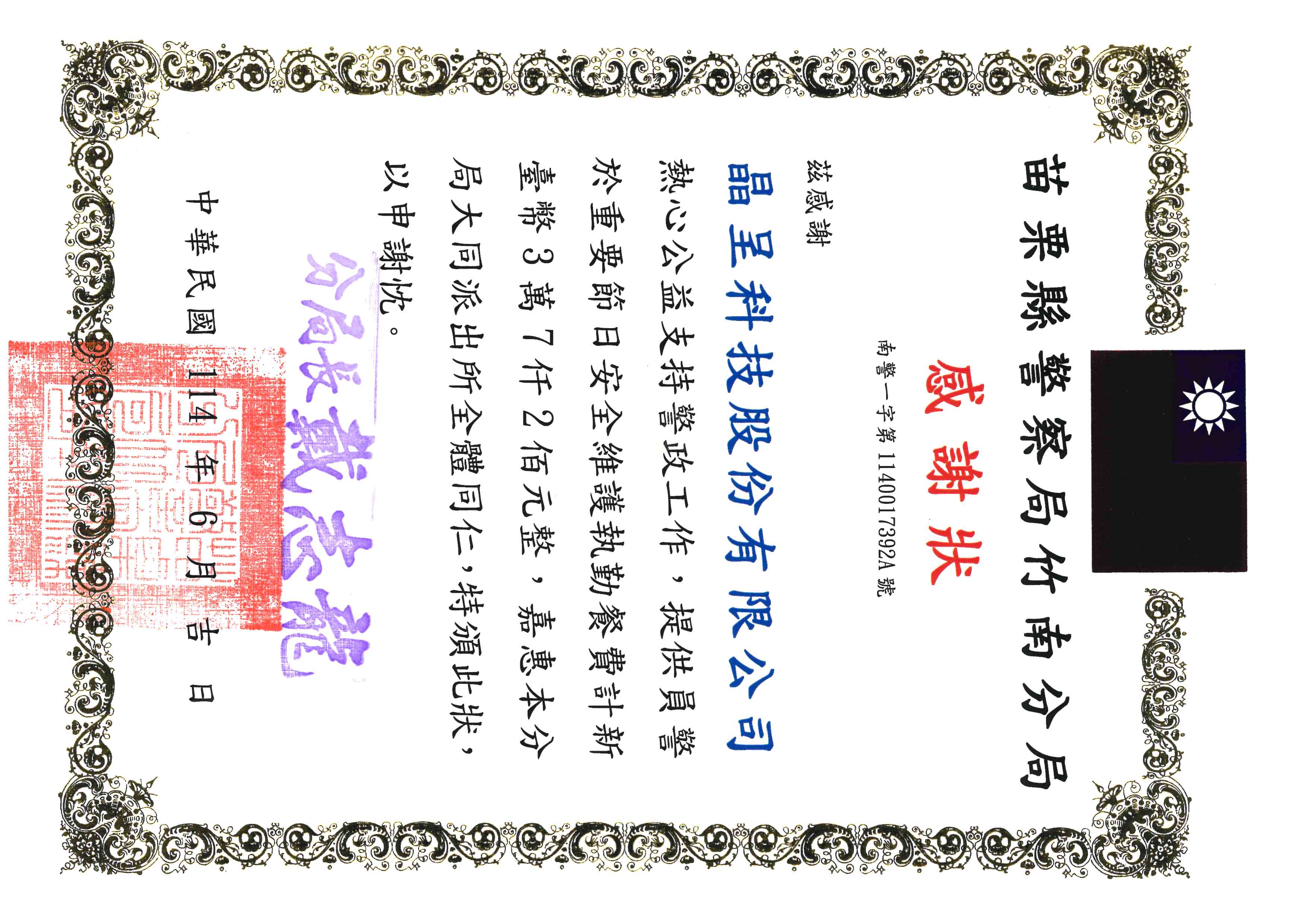Certificate of Appreciation from Zhunan Police Station